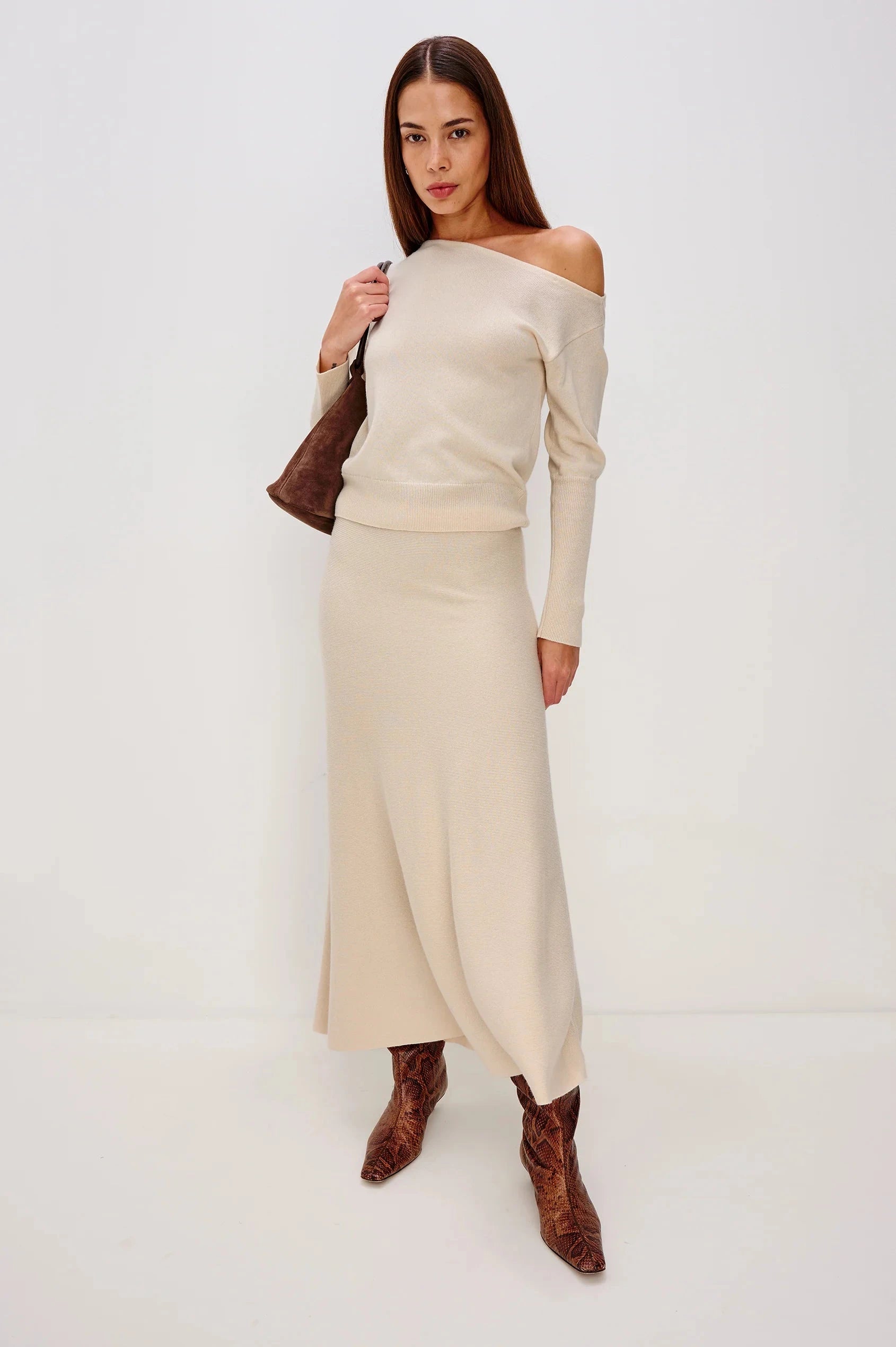 Comfort and style come effortlessly with the Tianna. This wool-blend sweater elegantly frames the décolletage with an off-shoulder neckline and dramatic. elongated sleeves that taper from the elbow.